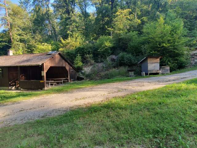Eine grosszügige Grillstelle mit zahlreichen Sitzgelegenheiten. Einige Sitzplätze befinden sich in einer kleinen, offenen Hütte und bieten Schutz bei schlechtem Wetter.